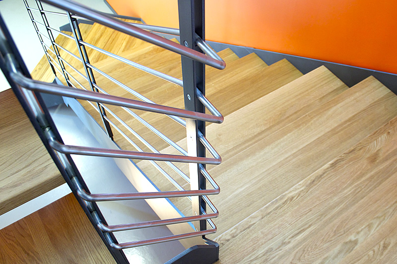 Samostoječe stopnišče s centralno nosilno konstrukcijo iz barvanega jekla. Nastopne ploskve so iz bukovega lesa.