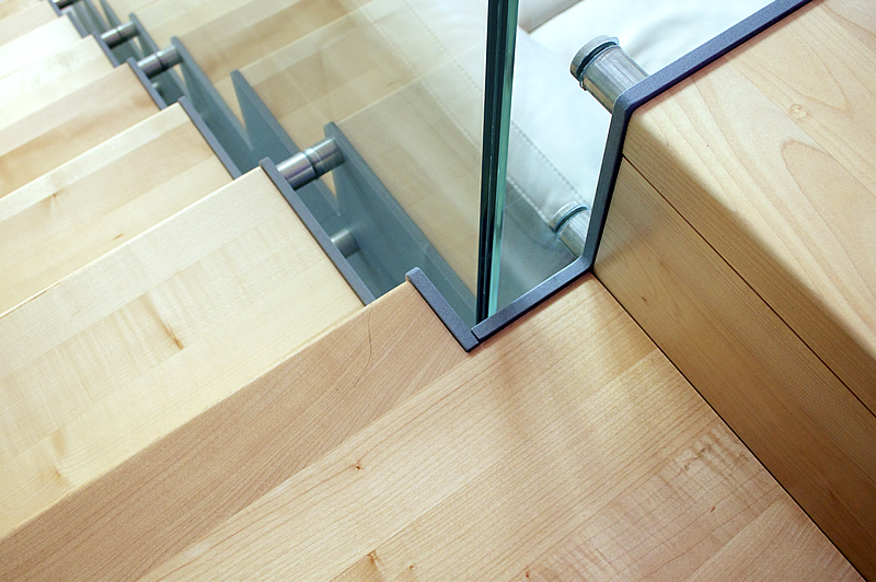 Samostoječe stopnišče z nosilno konstrukcijo iz barvanega jekla. Nastopne ploskve so iz javorovega lesa. Ograja iz kaljenega lepljenega stekla 6 + 6 mm.